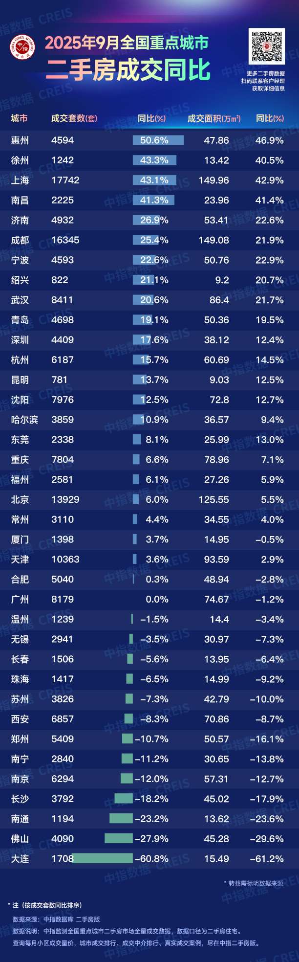 根据中国房地产指数系统百城价格指数,2025年9月,百城二手住宅均价环比下跌0.74%,同比下跌7.38%;十大城市二手住宅均价环比下跌0.67%,较8月略有扩大,同比下跌4.77%。