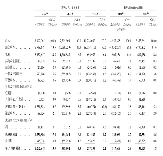财务方面,滨化集团主要从事有机及无机化工产品的生产及销售,主要产品涵盖三大分部:氯碱化学品、碳三碳四化学品及湿电子化学品。此外,公司亦自能源销售获得部分收入。于2022年度、2023年度、2024年度和2025年截至6月30日止六个月,公司分别取得收入88.92亿元(人民币,下同)、73.06亿元、102.28亿元和73.54亿元。