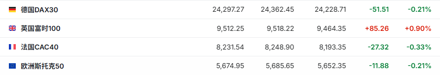 2. 截至发稿,德国DAX指数跌0.21%,英国富时100指数涨0.90%,法国CAC40指数跌0.33%,欧洲斯托克50指数跌0.21%。