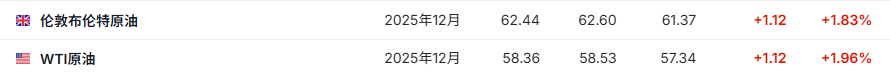 3. 截至发稿,WTI原油涨1.96%,报58.36美元/桶。布伦特原油涨1.83%,报62.44美元/桶。