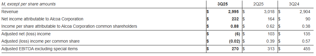 财报具体数据显示,美国铝业第三季度营收达29.95亿美元,较上年同期的29.04亿美元实现增长;归属于公司的净利润为2.32亿美元,上年同期为9000万美元,同比增长近158%;调整后净亏损600万美元,上年同期净利润为1.35亿美元;调整后每股亏损0.02美元,上年同期每股收益0.57美元;调整后息税折旧摊销前利润(EBITDA)为2.70亿美元,上年同期为4.55亿美元。