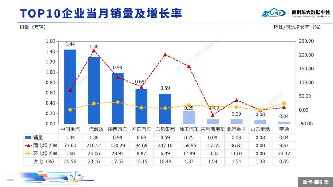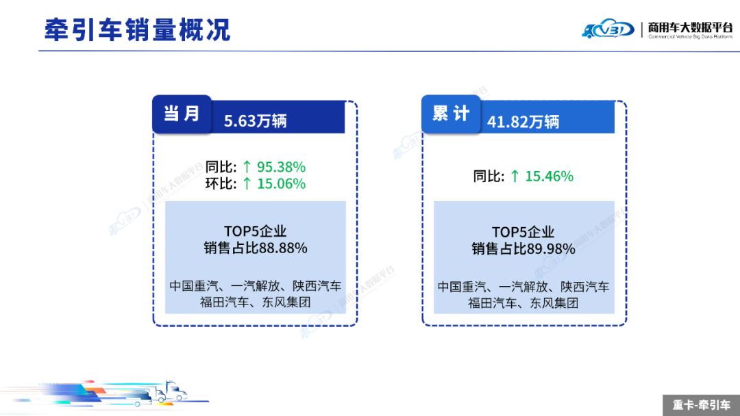 当月牵引车销量(批发)TOP5企业占比88.88%,依次为中国重汽、一汽解放、陕西汽车、福田汽车、东风集团。