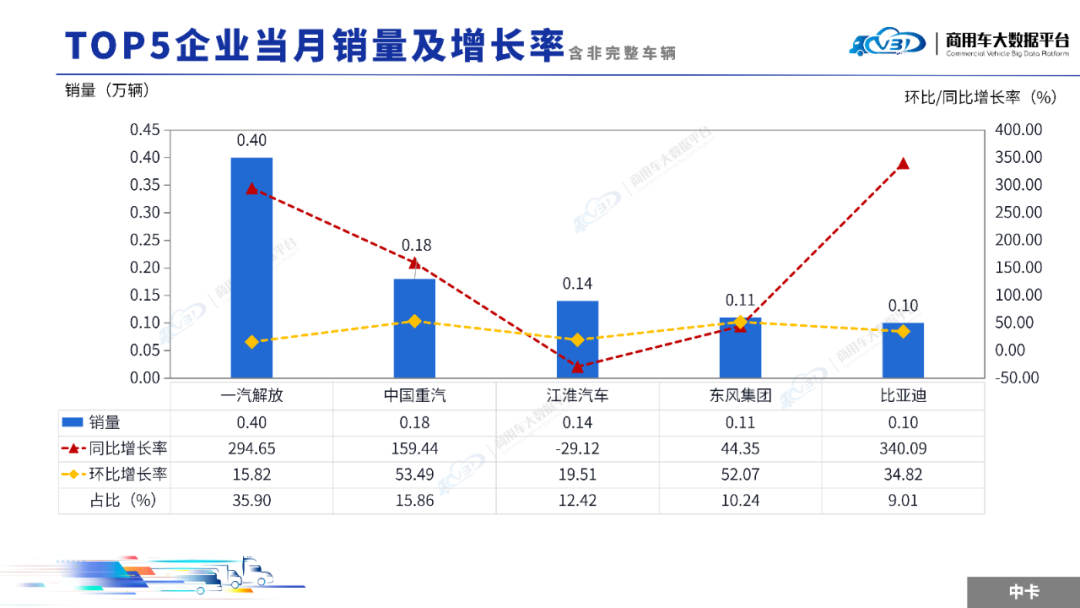 当月中型卡车销量(批发)TOP5企业占比83.43%,依次为一汽解放、中国重汽、江淮汽车、东风集团、比亚迪。