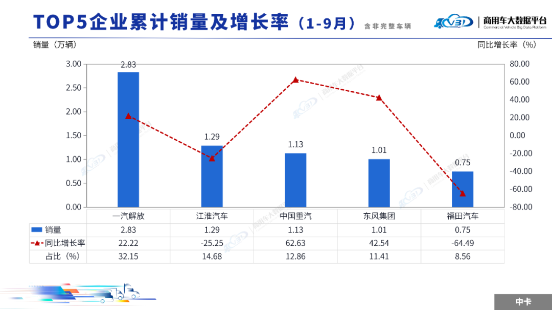 1-9月中型卡车销量(批发)TOP5企业占比79.66%,依次为一汽解放、江淮汽车、中国重汽、东风集团、福田汽车。