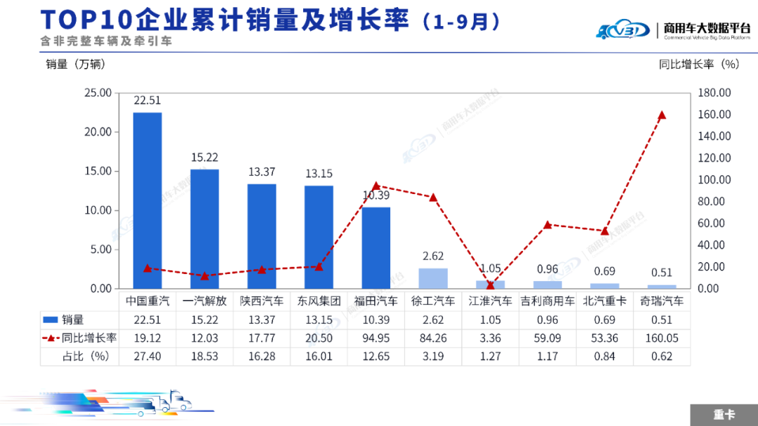 1-9月重型卡车累计销量(批发)TOP5企业占比90.87%,依次为中国重汽、一汽解放、陕西汽车、东风集团、福田汽车。