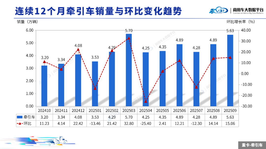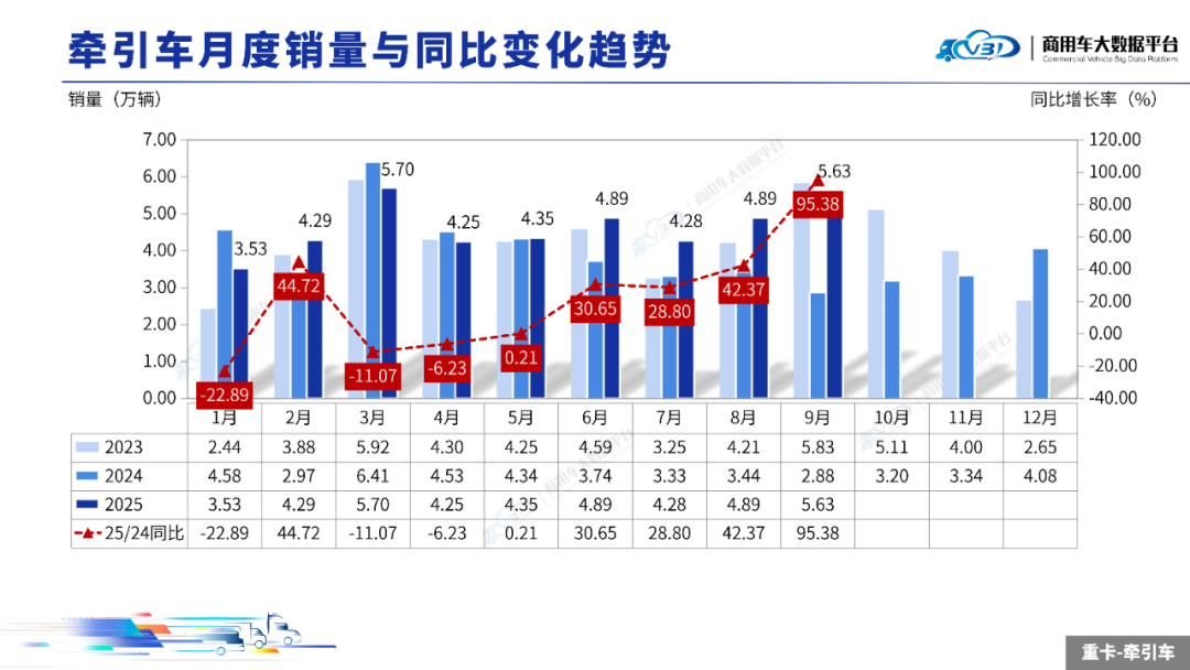 2025年9月全国牵引车销量(批发)为5.63万辆,同比增长95.38%,环比增长15.06%;1-9月累计销量(批发)为41.82万辆,同比增长15.46%。