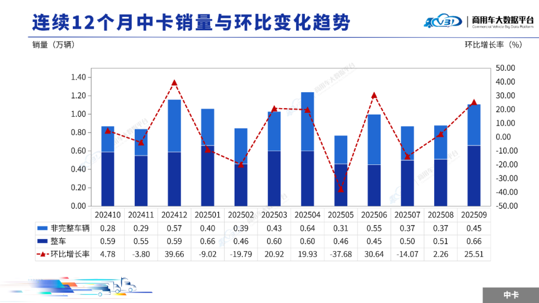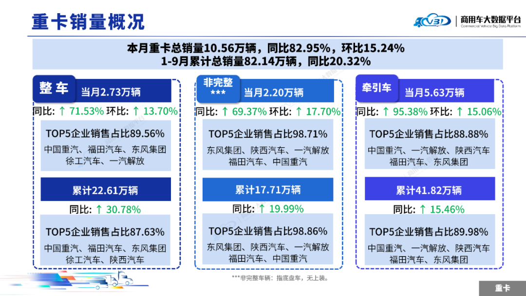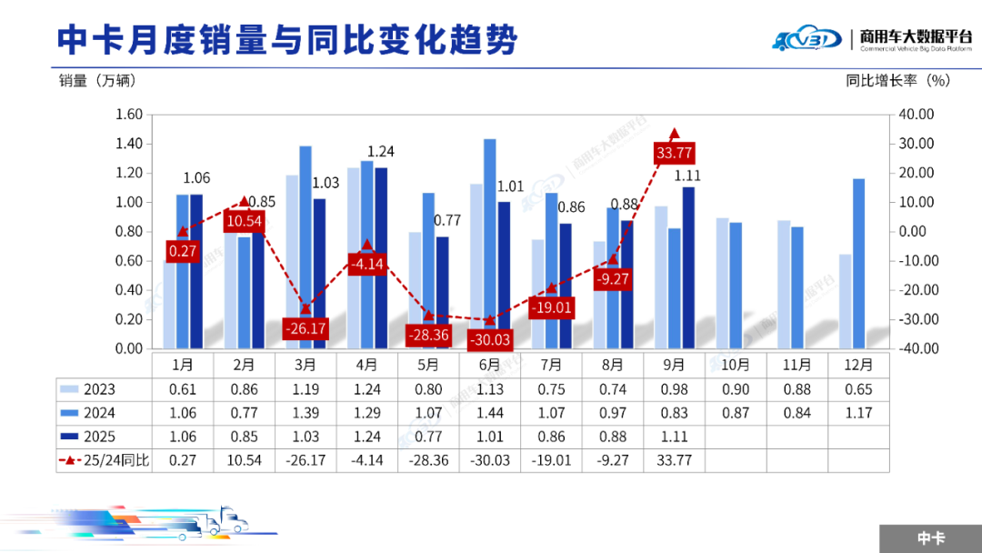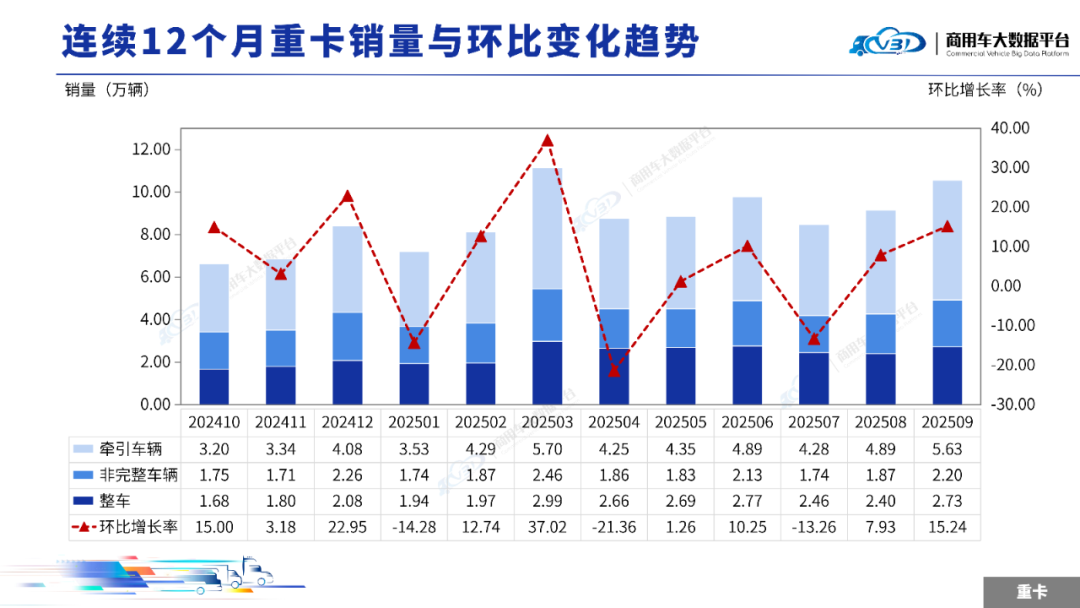 智通财经APP获悉,10月23日,中国汽车流通协会发布《2025年9月中重型卡车销量(批发)月度形势分析报告》。报告指出,9月全国重型卡车销量(批发)为10.56万辆,同比增长82.95%,环比增长15.24%;中型卡车销量(批发)为1.11万辆,同比增长33.77%,环比增长25.51%。