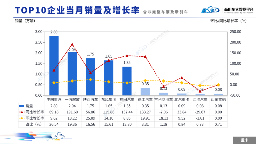当月重型卡车销量(批发)TOP5企业占比90.87%,依次为中国重汽、一汽解放、陕西汽车、东风集团、福田汽车。