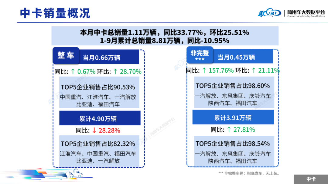 1-9月,重型卡车累计销量(批发)为82.14万辆,同比增长20.32%;中型卡车累计销量(批发)为8.81万辆,同比下降10.95%。