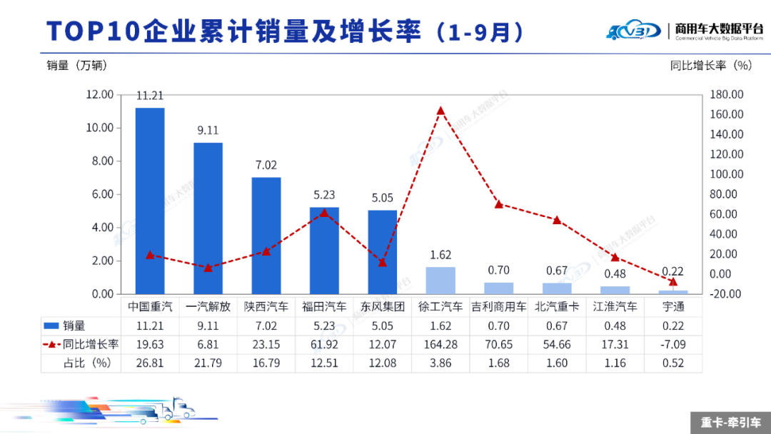 1-9月牵引车销量(批发)TOP5企业占比89.98%,依次为中国重汽、一汽解放、陕西汽车、福田汽车、东风集团。
