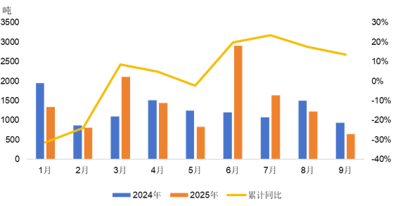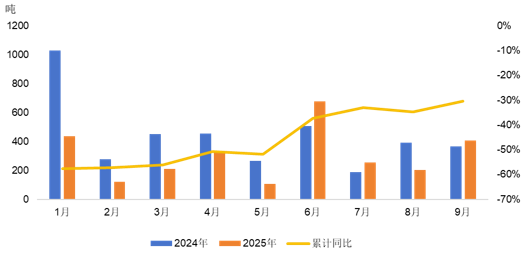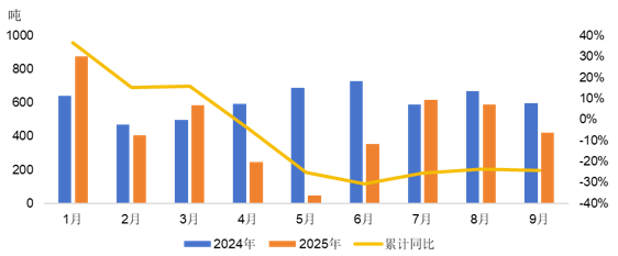 表1 2025年1-9月中国稀土产品进口情况(单位:吨,万美元)
