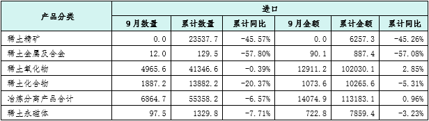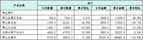 1-9月份,我国累计出口稀土冶炼分离产品4.8万吨,同比增长10.9%。累计出口稀土永磁材料4.0万吨,同比下降7.5%。