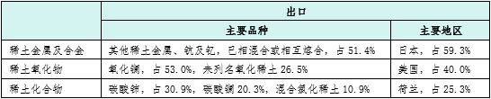 从出口品种来看,1-9月,在我国稀土金属及合金的出口中,其他稀土金属、钪及钇,已相混合或相互熔合出口量居首,为3,867吨,占比51.4%;稀土氧化物出口中以氧化镧出口量最大,为1.3万吨,占比53.0%,未列名氧化稀土次之,占比26.5%;稀土化合物的出口中碳酸铈出口量最大,为4,821吨,约占30.3%,碳酸镧和混合氯化稀土次之,分别占比20.3%和10.9%。