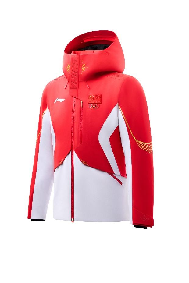 2026年米兰冬奥会中国体育代表团领奖装备,红、白两色为主色调,“中国红”充分彰显中国文化元素,在正面勾勒出象征着五角星的线条;“雪山白”灵感源自冬季运动场景,也融入了东方审美里的留白意境,并在侧身勾勒出李宁品牌标识线条,同时搭配以雪道为原型的金色流线型线条为点缀,全身以上红下白的色彩拼接,凸显中国运动健儿的挺拔身姿。