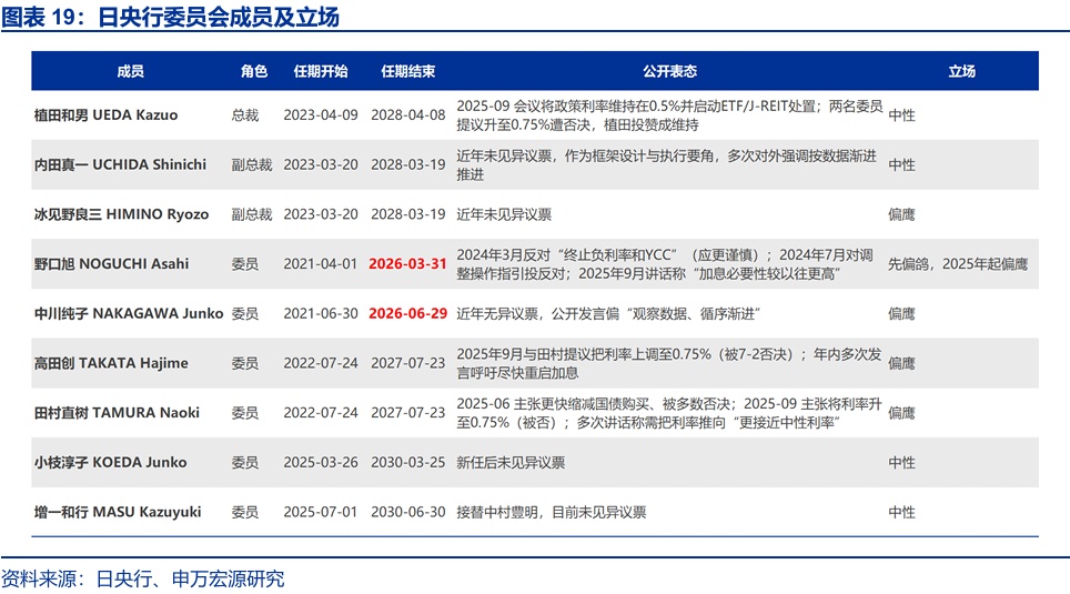 高市早苗对货币政策的影响相力对偏弱。高市对日央行的影响存在多方制约:1)《日本银行法》第3条明确货币政策独立性;2)高市可能无法效仿安倍替换日央行行长,现任行长植田和男任期至2028年4月8日;3)高市或仅能替换个别日央行委员,施加边际倾向。日央行货币政策委员会成员中,野口旭和中川顺子将在2026年届满到期,两人立场相对偏鹰,高市可经两院同意后提名鸽派委员。当前日央行政策委员会中,5人偏鹰,4人立场较为中性,即使高市成功任命鸽派委员,也难以逆转日央行方向。与日央行沟通协调可能是高市影响货币政策最主要、最现实的手段。