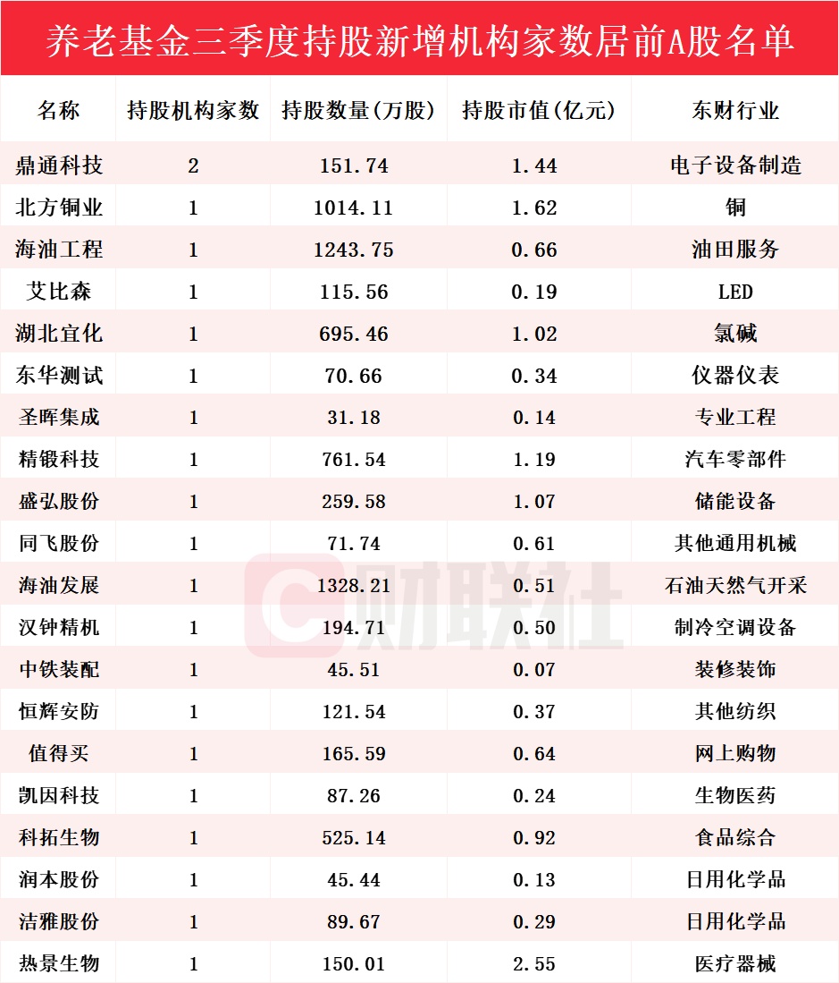 其中,鼎通科技(688668.SH)新增养老基金持股家数最多,达到2家。此外,北方铜业、海油工程、艾比森、湖北宜化、东华测试、圣晖集成、精锻科技、盛弘股份、同飞股份、海油发展、汉钟精机、中铁装配、恒辉安防、值得买、凯因科技、科拓生物、润本股份、洁雅股份和热景生物新增养老基金持股家数均达到1家。具体情况如下图: