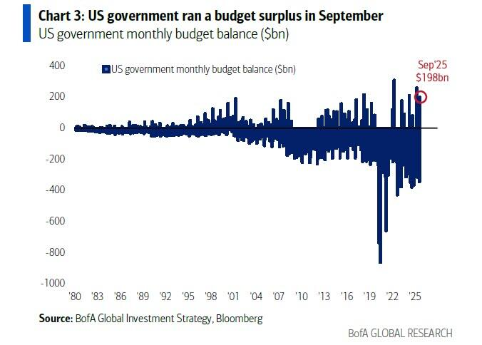 从宏观层面上,Hartnett提出质疑,认为支撑金价的“贬值交易”逻辑并不牢固。他给出了三点理由:第一,10年期美国国债收益率低于4%;第二,美国在9月份实现了预算盈余;第三,衡量美元强弱的美元指数(DXY)始终未能跌破4月份的低点。这些因素共同表明,做空美元、做多黄金的交易基础或许并不如想象中坚实。