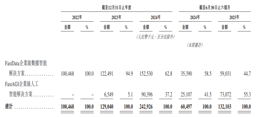 深入剖析来看,FastAGI企业级人工智能解决方案无疑是滴普科技加速成长背后的最大亮点,该业务在2023年推出后便迅速成为公司的第二增长曲线:收入从2023年的约655万元猛增至2024年的约9040万元,到2025年上半年,该业务收入已达7307万元,同比增幅高达191%,占总营收比重提升至55.3%,成功超越传统优势的FastData解决方案。这标志着滴普科技已进入“Data+AI”双轮驱动、协同发展的新阶段。