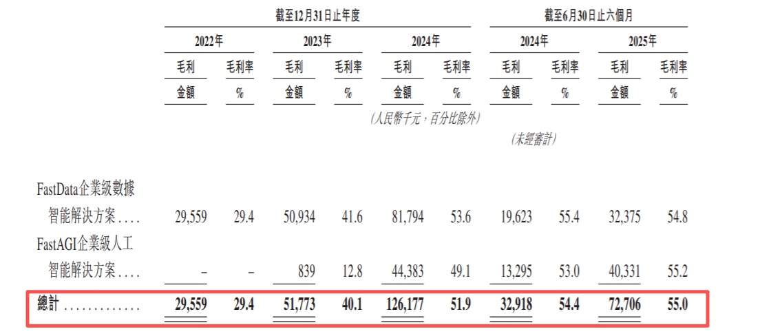 在规模扩张的同时,滴普科技的盈利质量也显著提升。数据显示,2022至2024年,滴普科技的毛利率分别为29.4%、40.1%、51.9%,并在2025年上半年提升至55%,这主要得益于公司业务及技术趋于成熟之后,解决方案的易用性和适配性带来了显著的规模经济效益,这也从侧面反应出了滴普科技产品于市场中的强大竞争力和强定价能力。