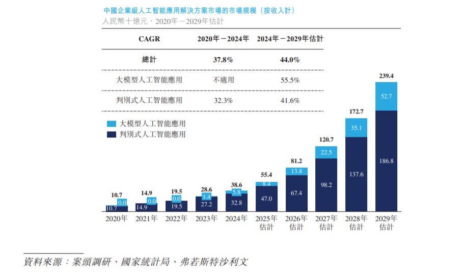 国内企业普遍面临数据质量低、模型适配难等挑战,对可为企业构建专属模型及对应业务场景的解决方案,同时还能兼顾数据私密性、专属性与更高产品性价比的需求十分强烈。且为鼓励国内AI产业的加速发展,《关于深入实施“人工智能+”行动的意见》设定了到2027年重点领域AI应用普及率超70%的量化目标。弗若斯特沙利文数据,2024年至2029年,中国企业级大模型AI应用市场规模将从58亿元增长至527亿元,年复合增长率高达55.5%。