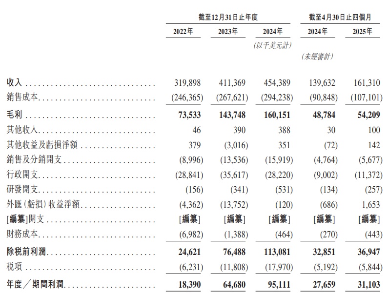 财务方面,于往绩记录期间,乐舒适实现了稳定增长,盈利能力持续提升。公司的收入由2022年的3.20亿美元增加至2024年的4.54亿美元,复合年增长率为19.2%,并由截至2024年4月30日止四个月的1.40亿美元增加15.5%至截至2025年4月30日止四个月的1.61亿美元,原因是公司持续提高在现有非洲市场的渗透率,同时借助其品牌知名度及广泛的销售网络将业务扩展至拉丁美洲及中亚。
