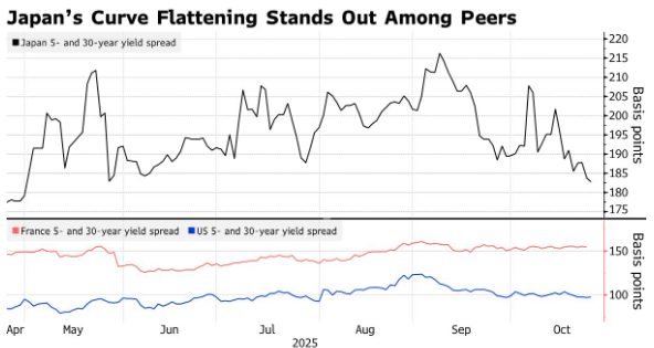 这一转变反映出市场预期日本央行将重新开始提高利率,而长期债券收益率应会趋于稳定,因为新首相高市早苗的财政政策似乎不像此前所担心的那样激进。不过,任何大规模的财政刺激措施都可能改变这一观点,因为这会引发对债券供应的担忧,并使收益率曲线变得更加陡峭。