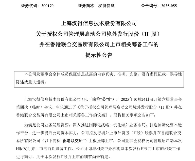 智通财经APP获悉,近日,汉得信息(300170.SZ)发布公告称,为满足公司业务发展需要,深入推进国际化战略,公司拟发行境外上市外资股(H股)股票并在港交所主板挂牌上市,公司董事会授权管理层启动此次H股发行并上市的前期筹备工作,计划与相关中介机构就此次发行H股并上市的相关工作进行商讨,目前细节尚未确定。