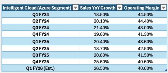 于整个微软股票而言,主要的“推动因素”往往是 Azure 能否维持同比增长约 37%,正如管理团队对 2026 财年第一季度的预测一样。