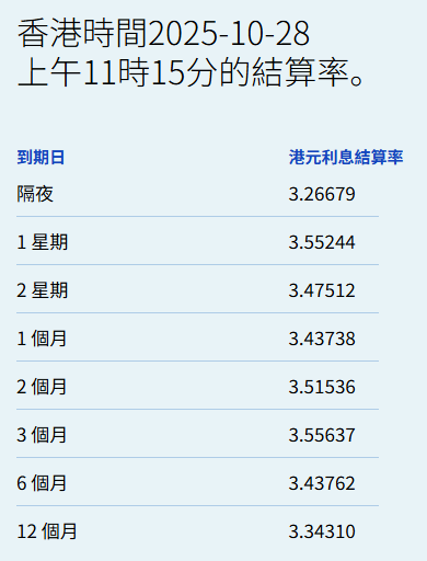 智通财经APP获悉,10月28日,港元拆息个别发展,而与楼按相关的一个月拆息升转跌报3.43738%,跌6.262基点;反映银行资金成本的三个月拆息报3.55637%,跌3.625基点。