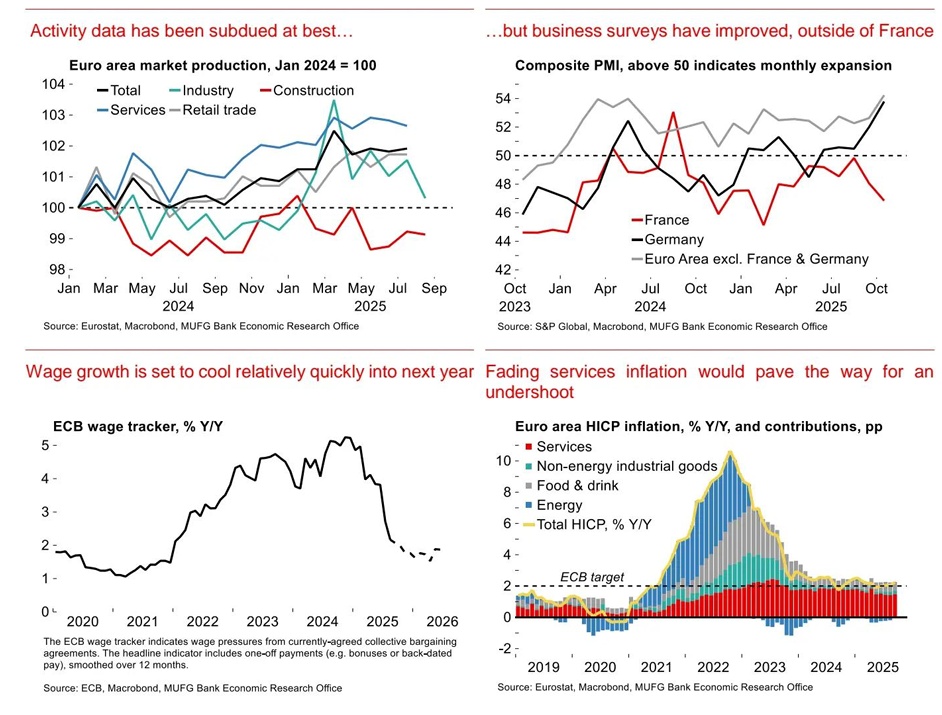 Cook表示,欧元区三季度GDP初值将在欧洲央行利率决议前夕公布,德国10月通胀以及欧元区整体HICP(调和消费者物价指数)亦将公布。MUFG驻伦敦经济学家Cook认为欧洲央行对这些数据心中有数,未必影响周四的货币政策决定。“任何程度的GDP走弱(我们跟踪环比约0.0%——与欧洲央行预期一致)都将被10月意外强劲的PMI数据所对冲,后者显示欧元区下行风险可能大幅消退。欧元区综合产出指数(即综合PMI)在法国政治动荡、德国数据偏弱的背景下仍升至17个月高点52.2,凸显欧元区产出价格指标大幅回暖。”Cook表示在研报中写道。