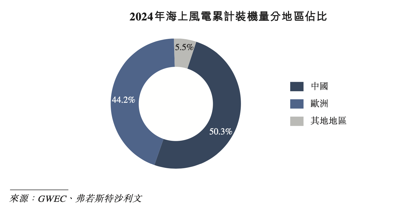 中国与欧洲已成为推动全球海上风电发展的核心力量。截至2024年底,全球海上风电累计装机量中,中国贡献约一半的装机规模,而欧洲则以英国、德国、荷兰和丹麦为代表,中欧合计占全球装机量约94.5%。