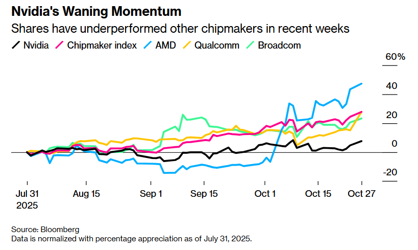 英伟达动能似乎减退——该股近几周跑输其他芯片巨头