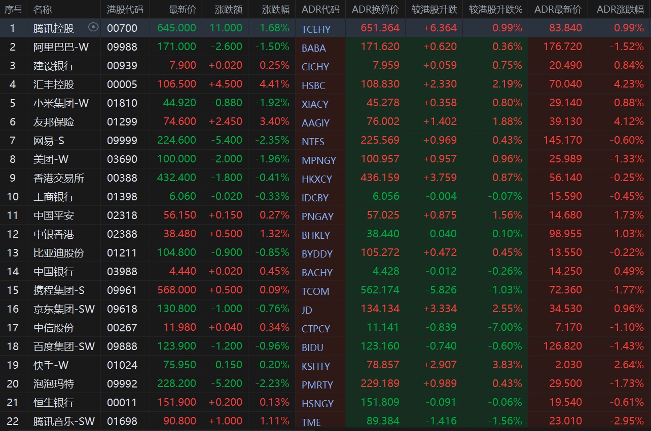 大型蓝筹股多数上涨,汇丰控股收报108.830港元,较香港收市涨2.19%;腾讯控股收报651.364港元,较香港收市涨0.99%。
