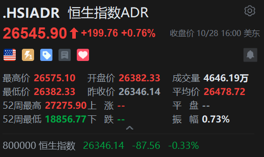 智通财经APP获悉,周二,美股三大指数集体收涨。恒生指数ADR上涨,按比例计算,收报26545.90点,较香港收市升199.76或0.76%。