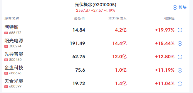 光伏赛道午后爆发,隆基绿能、阿特斯、弘元绿能等涨停,阳光电源涨超8%,创历史新高。