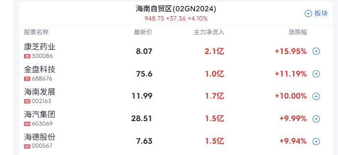 海南自贸概念持续走高,海南发展、海德股份、海汽集团等涨停,康芝药业、海南矿业等跟涨。