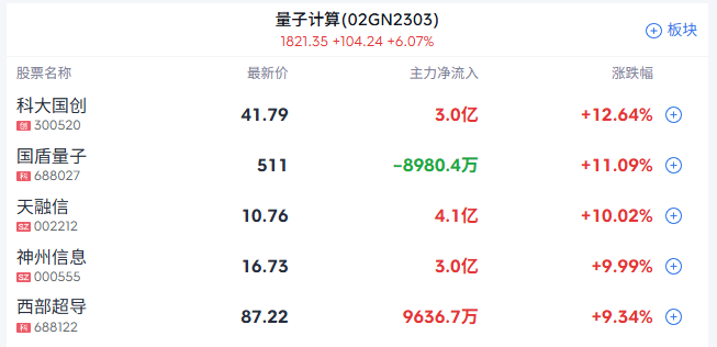 量子科技概念近期反复走强,神州信息、天融信涨停,西部超导、科大国创、国盾量子等跟涨。
