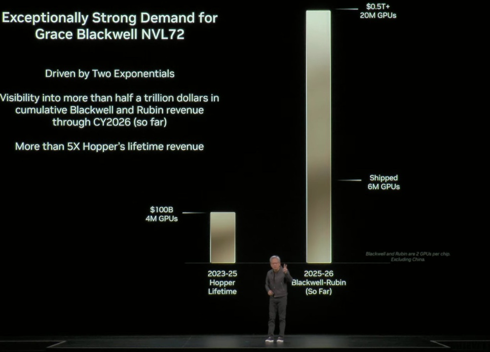 最令华尔街分析师们感到兴奋的消息无疑在于:黄仁勋给出的“2025—2026年累计5000亿美元数据中心业务营收可见度——即来自 Blackwell 与下一代Rubin架构AI GPU系列产品“未来五个季度累计”的数据中心业务营收。
