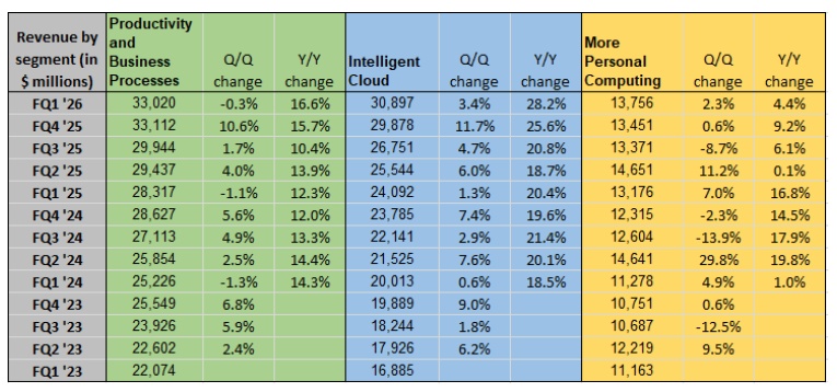 分业务来看,智能云部门(含 Azure)部门营收达 309 亿美元,较去年同期增长 28%,高于市场平均预期的 302.5 亿美元。Azure 与亚马逊网络服务(Amazon Web Services)、谷歌云(Google Cloud)展开竞争,经汇率波动调整后,Azure云计算业务本季度营收增长39%,超过华尔街37%的预。
