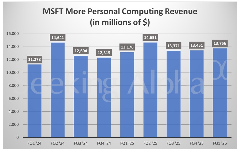 更多个人计算部门包含 Windows 系统、搜索广告、设备及视频游戏业务,营收增长 4% 至 138 亿美元,高于市场预期的 128.3 亿美元。