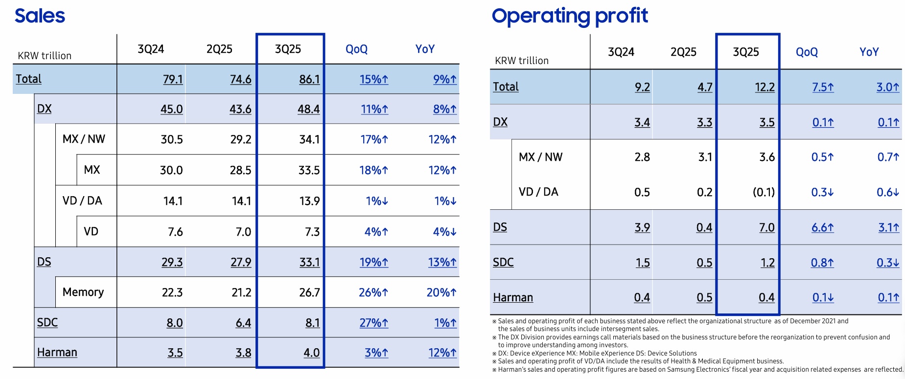 三星电子周四公布的财报显示,该公司第三季度销售额为86.1万亿韩元,同比增长9%;营业利润为12.2万亿韩元;净利润为12.0万亿韩元,高于分析师平均预期的9.3万亿韩元。
