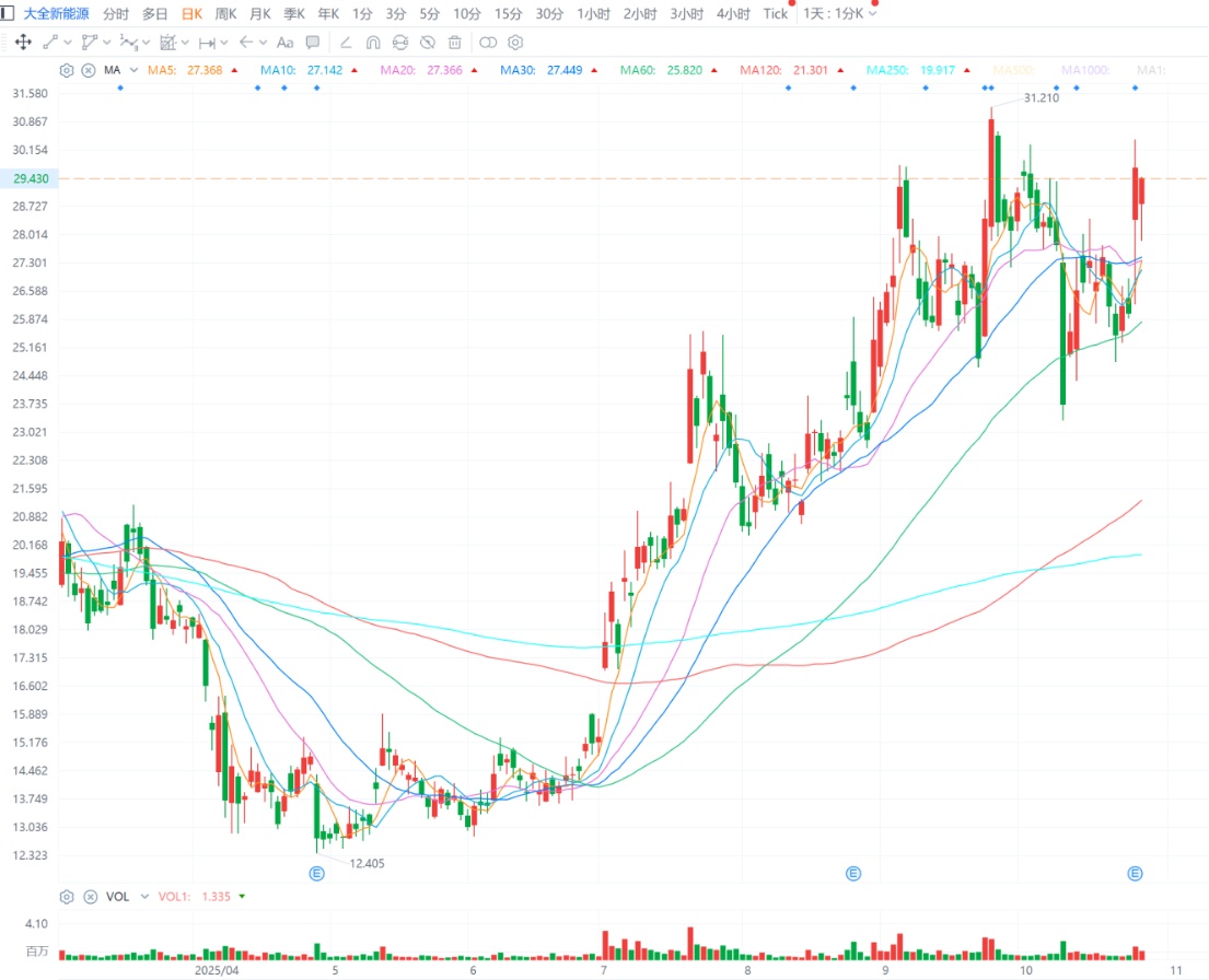 而受益于强劲财报,10月27日,大全新能源美股股价大幅收涨14.06%,盘中最高价达到30.28美元,已接近今年的年内股价高点,能否继续向上突破便成为投资者关注的焦点。