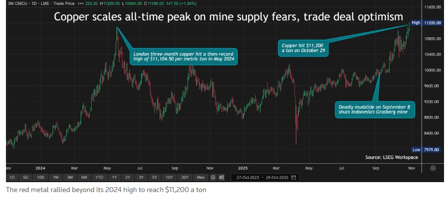 这一天然的红色金属的交易价格超越其2024年最高点,触及每吨11,200美元。伦敦金属交易所(LME)的基准期铜盘中一度上涨1.5%,至每吨11,200美元,此前早些时候已突破其在2024年5月创下的11,104.50美元的上一个历史纪录高位。当前LME期铜报价11,190.50美元。