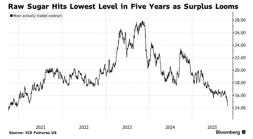 华尔街分析师们普遍预期行业龙头巴西将在2025/26年料继续高位产糖;多家投资机构上调巴西中南部产量与出口预期,且该国“从甘蔗到糖”的分配比例仍偏高(“高糖比”)——这直接向全球抛出更多现货与远期货源,压低价格。美国农业部(USDA/FAS)最新展望显示,预计 2025/26 全球产糖创纪录、期末库存上行,巴西产量与出口维持高位。