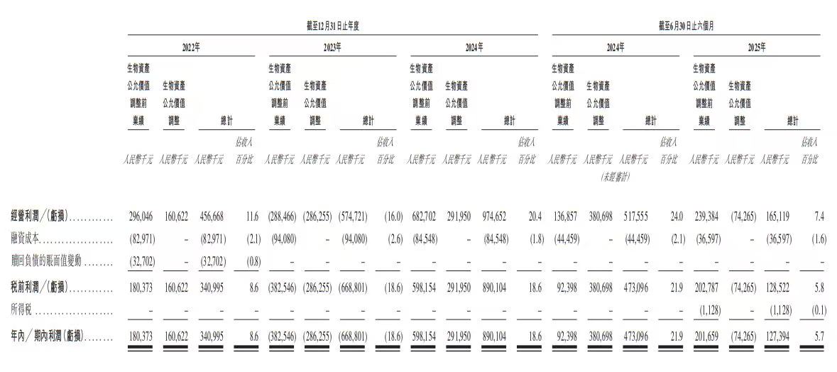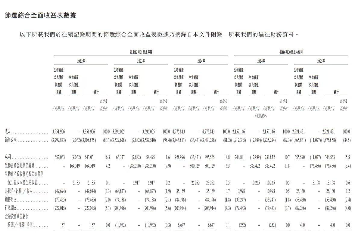 业绩方面,2022年、2023年、2024年、2025年截至6月30日止六个月,天农食品实现收入分别约为39.52亿元、35.96亿元、47.76亿元、22.21亿元人民币;同期,年内/期内利润约为3.41亿元、-6.69亿元、8.90亿元、1.27亿元人民币。