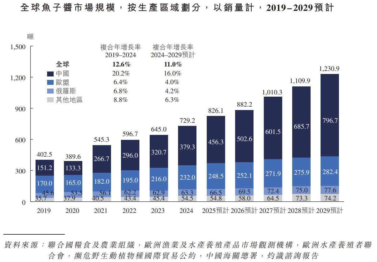 根据联合国粮食及农业组织(FAO),全球鲟鱼捕捞量在1977年达到历史峰值。21世纪以来,人工养殖鱼子酱的供应逐步增加,但由于人工养殖鲟鱼的投资周期长、投入规模大等进入门槛高,全球鱼子酱供应量依然远低于历史高点,市场中长期处于供不应求的状态。2024年全球鱼子酱销量为729.2吨,预计将在2029年达到1,230.9吨,复合年增长率为11.0%;预计2029年销量仍然远低于1977年水平,呈现巨大的供需缺口。