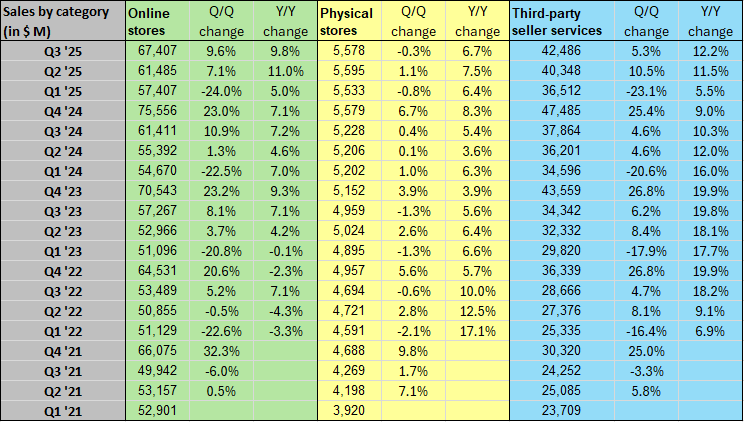 若按类别划分,在线商店收入同比增长10%,至674亿美元;第三方卖家服务收入同比增长12%,至425亿美元;广告服务收入同比增长24%,至177亿美元;实体商店收入同比增长7%,至56亿美元;订阅服务收入同比增长11%,至126亿美元。