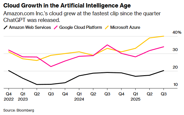 亚马逊AWS在第三季度的强劲表现打消了投资者对这家全球最大云计算服务提供者正被竞争对手迎头赶上的担忧,。在第二季度,微软(MSFT.US)的Azure云业务增长速度几乎是AWS的两倍,而Alphabet(GOOGL.US)旗下谷歌云(Google Cloud)增长了33.5%。财报发布前,投资者对亚马逊云业务的预期相对较低,因为该公司最近几个季度曾提到新数据中心投产受限。首席执行官贾西(Andy Jassy)和其他高管曾表示,他们对云业务持乐观看法,但并未明确预测增长将重新加速。
