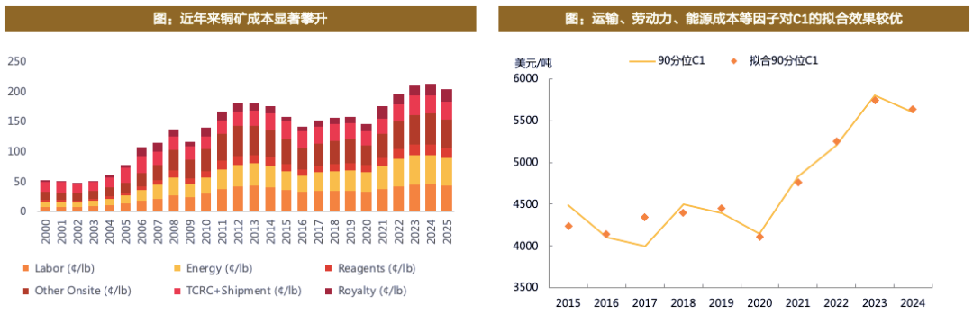 2020年之后,多因素推动铜矿成本明显走高。全球能源成本和劳动力成本等大幅抬升,驱动90分位铜矿成本走高,2024年相较于2020年增长约46%。