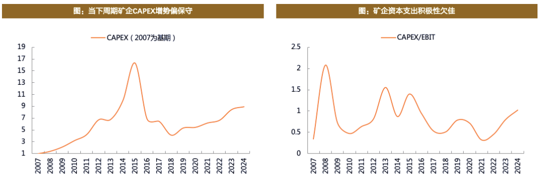 1)矿端已然处于防御性资本开支阶段,难以与2000-2015年期间相提并论。2020年之后,即使铜价创出历史新高,受到品位下滑、铜矿主产国铜矿保护政策等多重因素的扰动,CAPEX的增速也不及此前高,另一个角度,从CAPEX/EBIT指数亦能够看出企业进行资本支出的意愿有边际回升,但也相对此前略低迷。